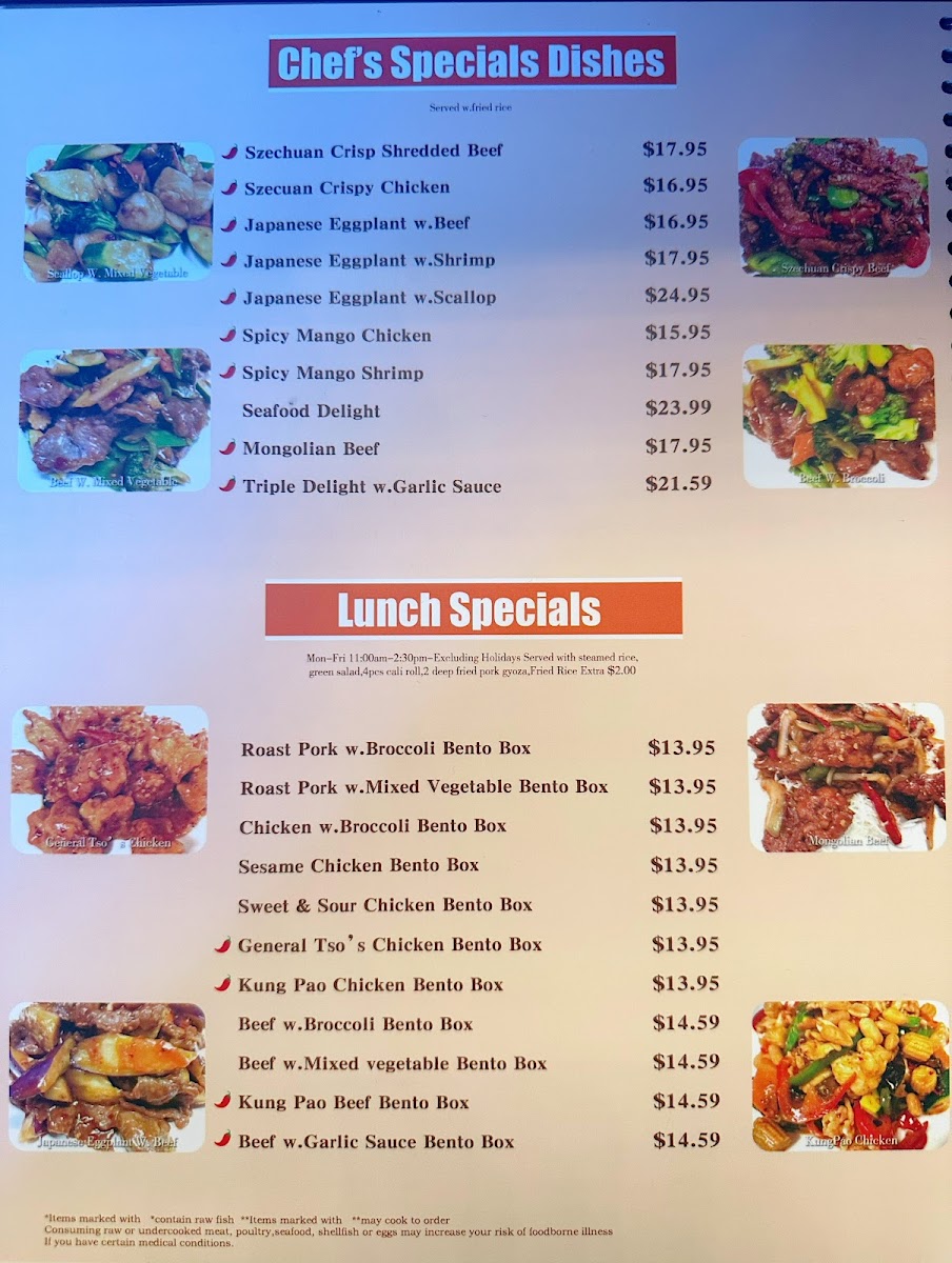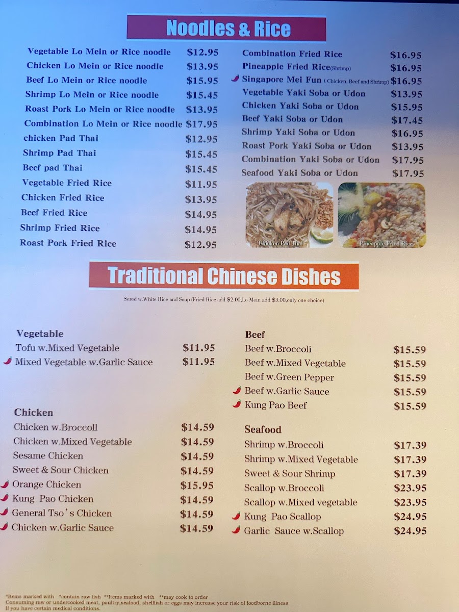 Served with white rice and soup (fried rice or lo mein for an additional charge. Only one choice).