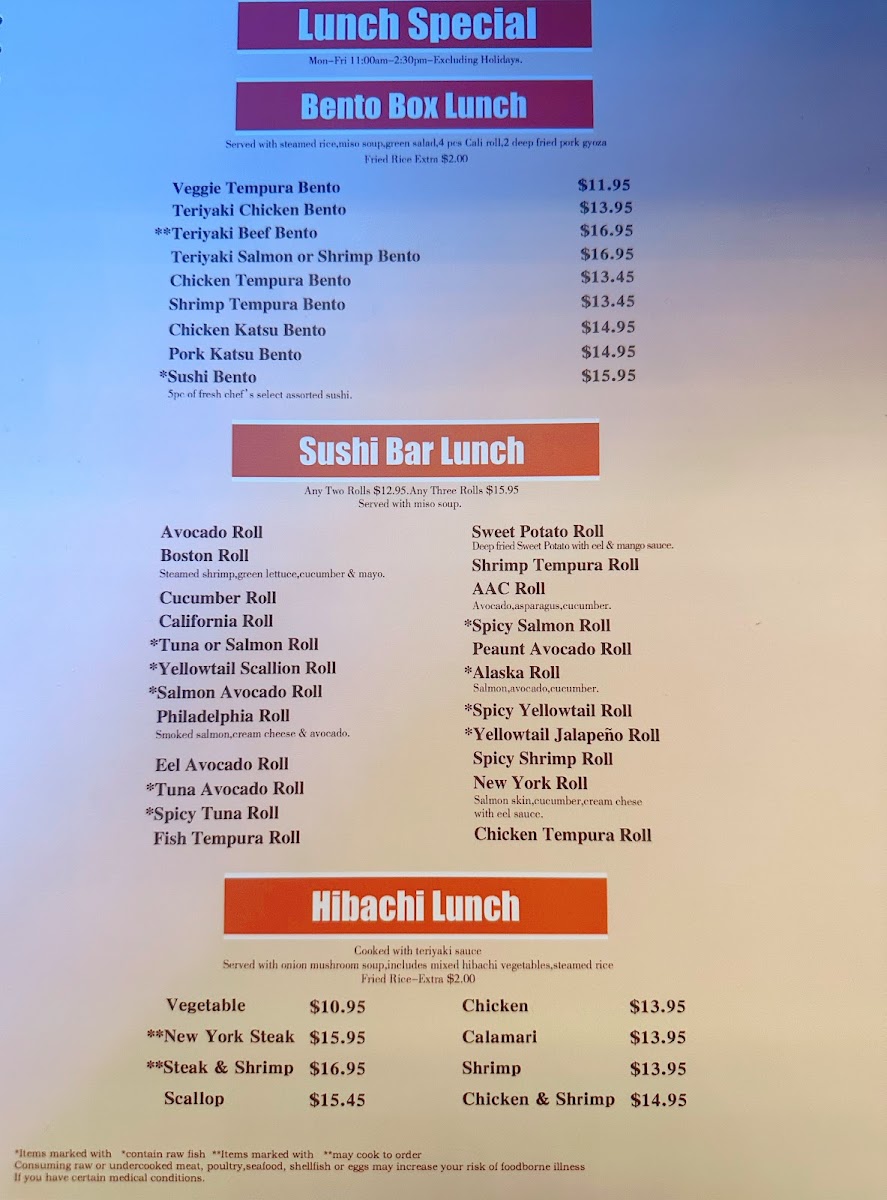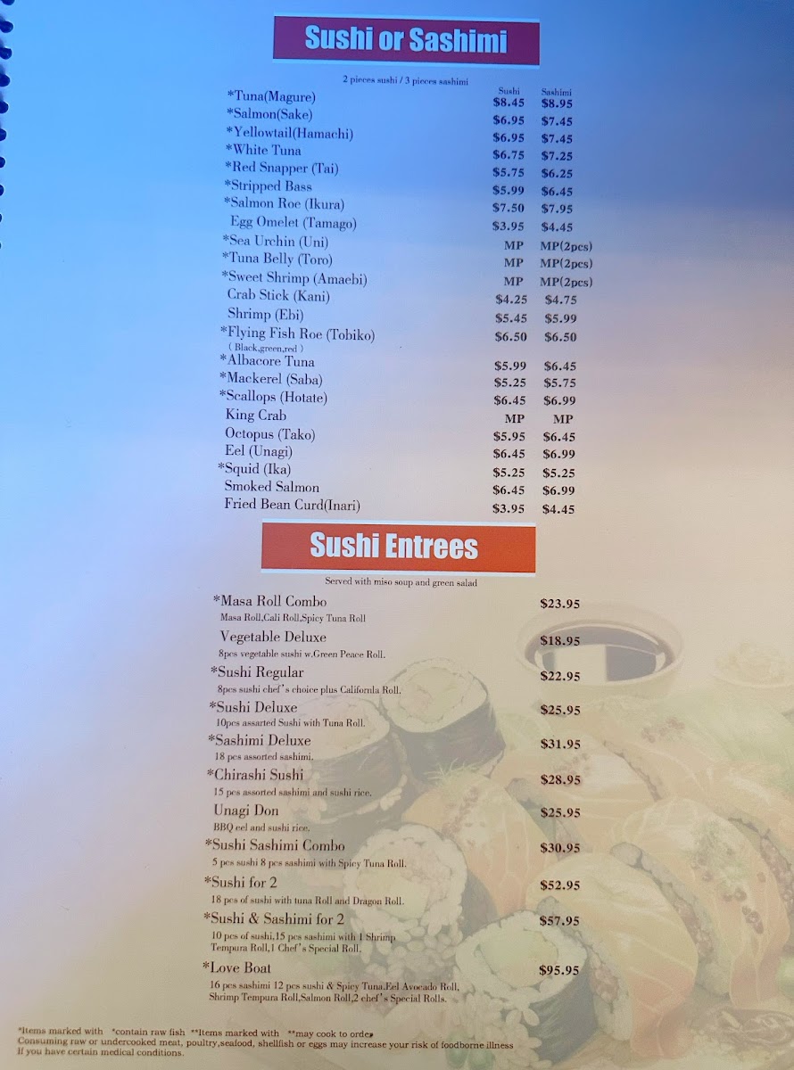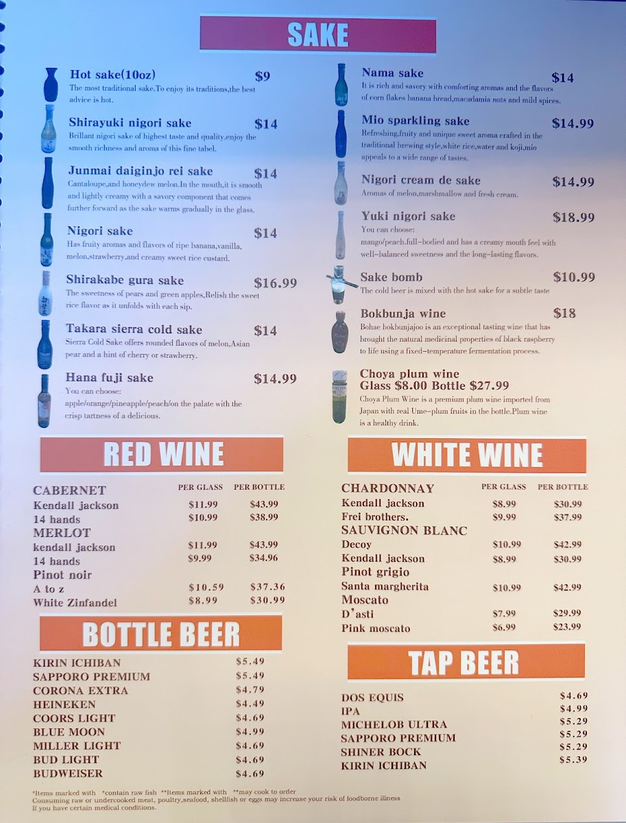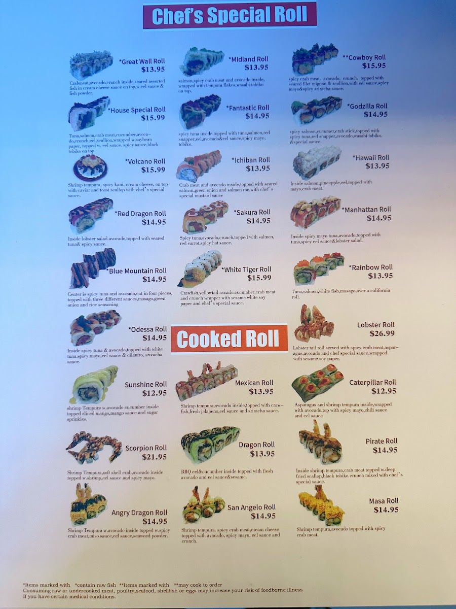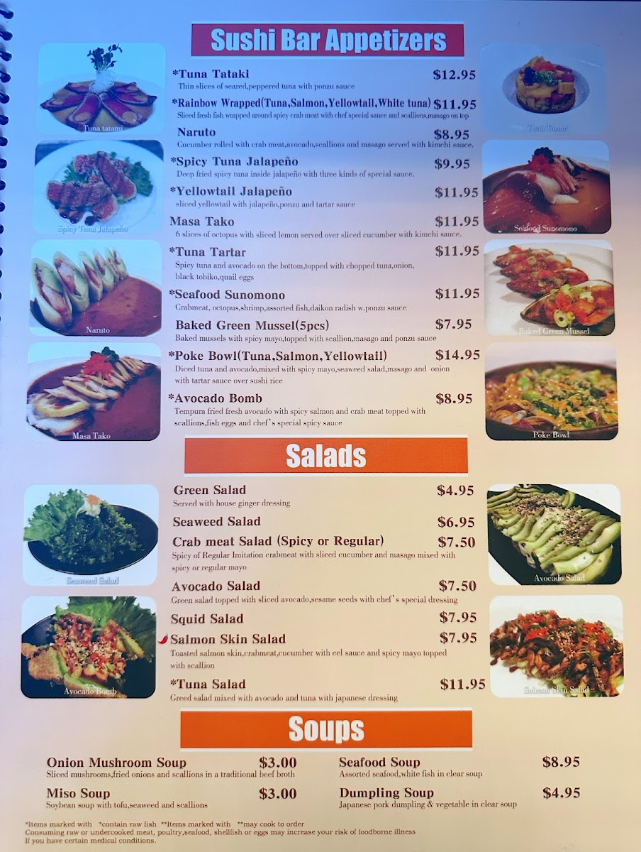 Raw; spicy salmon, cucumber, crab stick, topped with spicy tuna, red snapper, avocado, wasabi tobiko and special sauce.