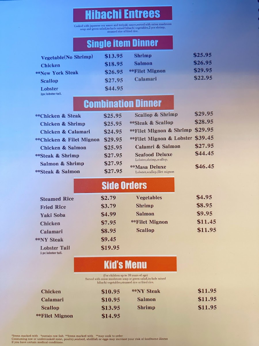 Served with onion mushroom soup, include mixed hibachi vegetables, steamed rice or fried rice.