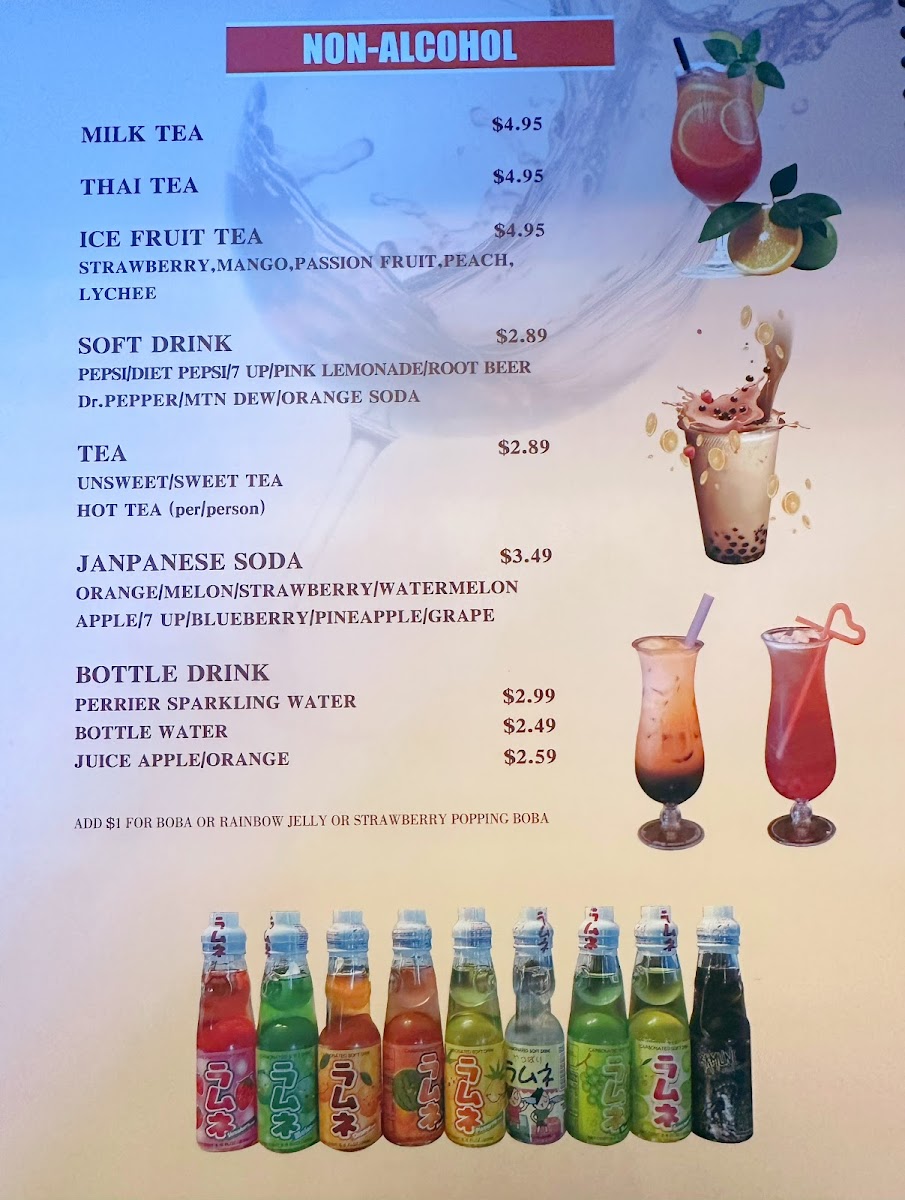 Pepsi, Diet Pepsi, 7 Up, Lemonade, Root Beer, Dr Pepper, Mtn Dew, Orange Soda.